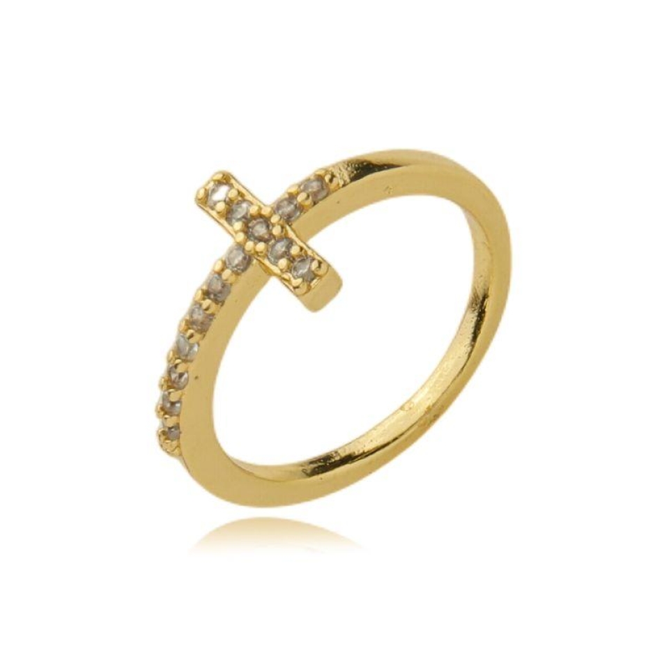 FECHAREste anel apresenta uma cruz central, meticulosamente cravejada com zircônias que proporcionam um brilho intenso e refinado. O design delicado, combinado com o banho de ouro 18k, confere à peça um acabamento sofisticado e durável.