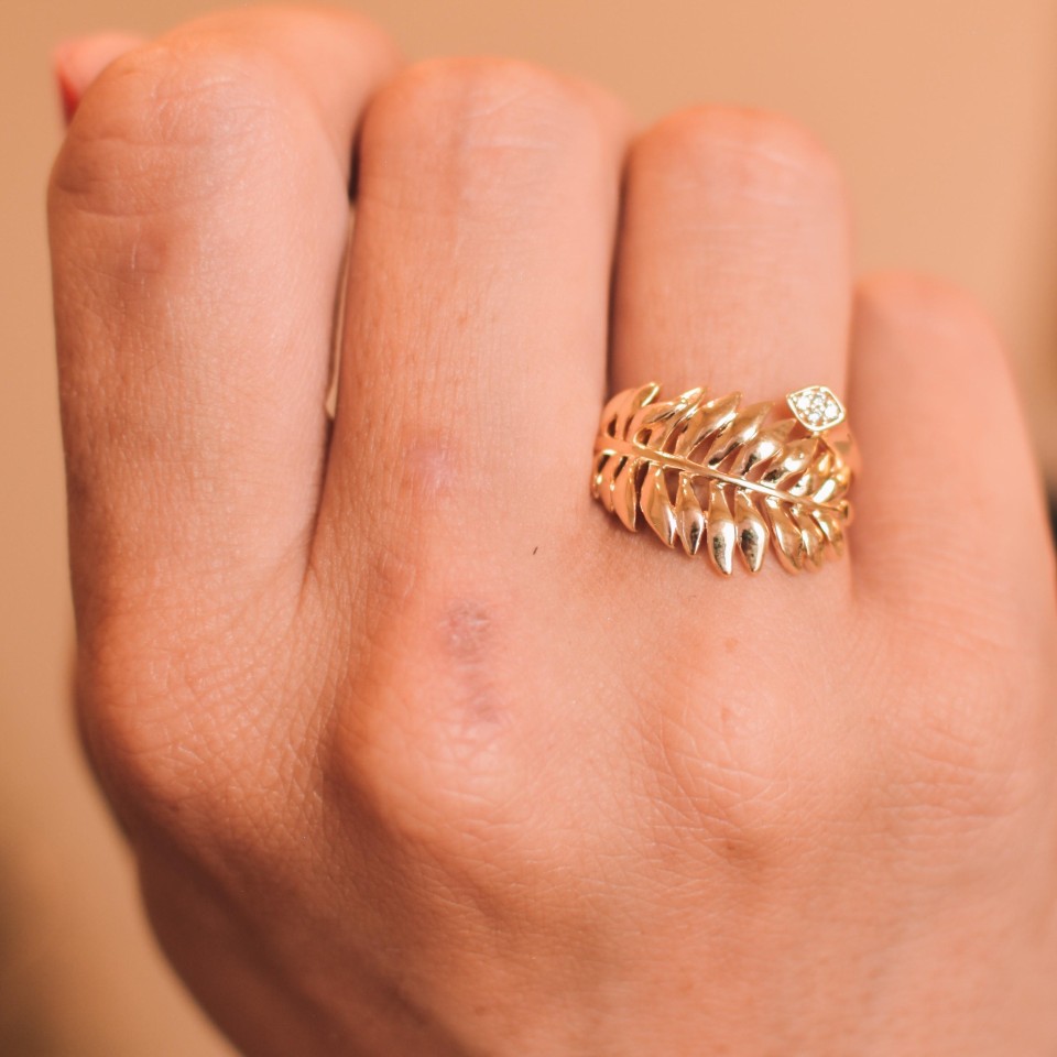 FECHARAnel banhado a ouro 18k em formato de folha com ma gota cravejada com micro zircônias de cristal.
