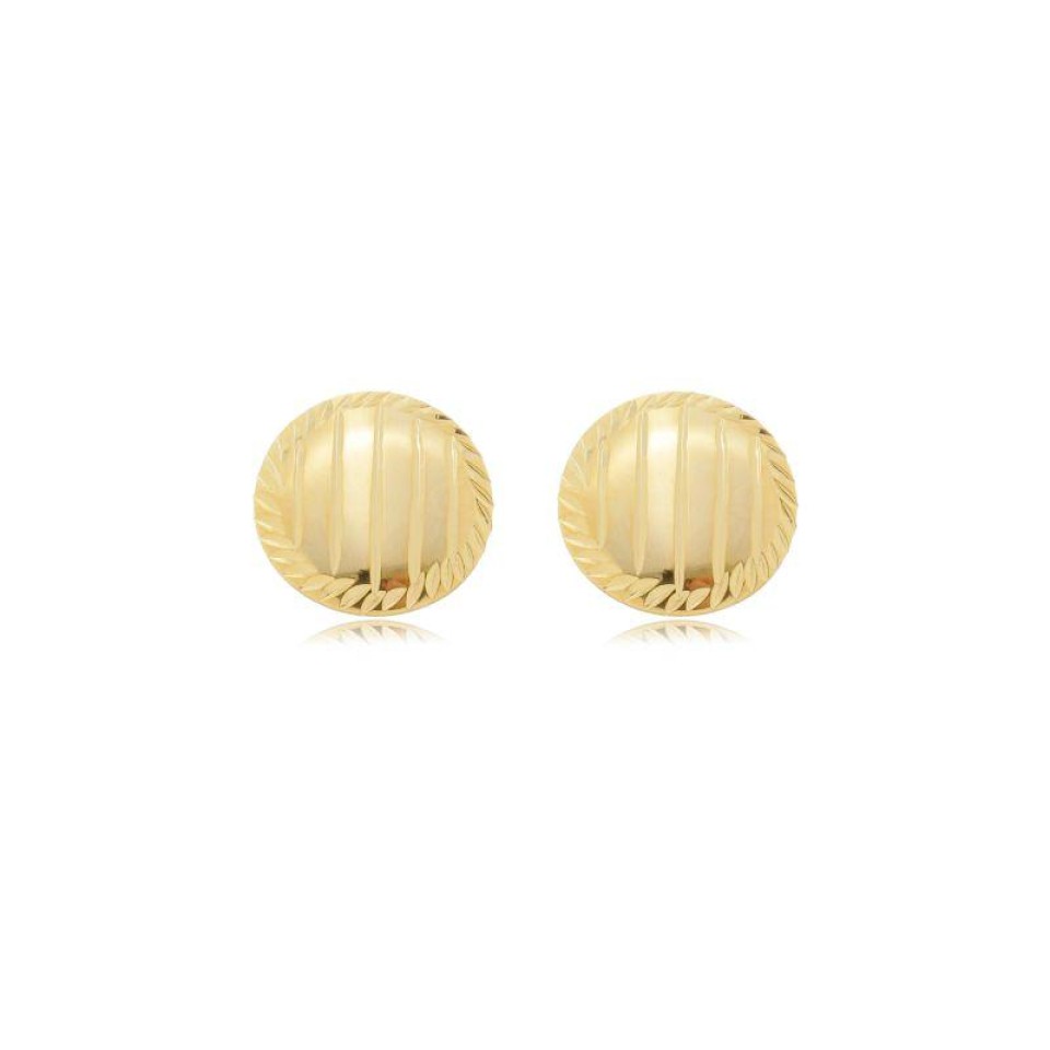 FECHARBrinco redondo diamantado 20 mm riscado semijoia banhada a ouro 18k acabamento diamantado com textura riscada que reflete a luz com delicadeza peça leve discreta e elegante perfeita para o dia a dia ou para compor produções mais sofisticadas acessório versátil com brilho sutil e design clássico que nunca sai de moda.