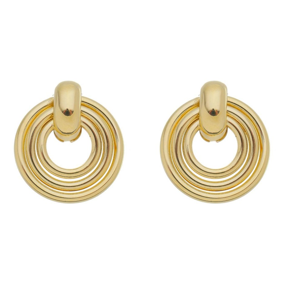 FECHARBrinco réplica banhado a ouro 18k com três aros em formato de disco.