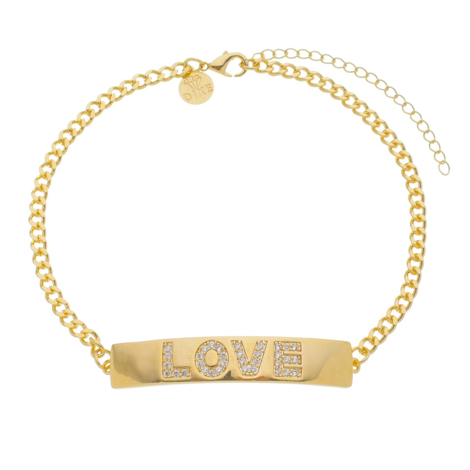 FECHARPulseira elo cadeadinho banhada a ouro 18k com chapa lisa com escrita love cravejada com micro zircônias de cristal.